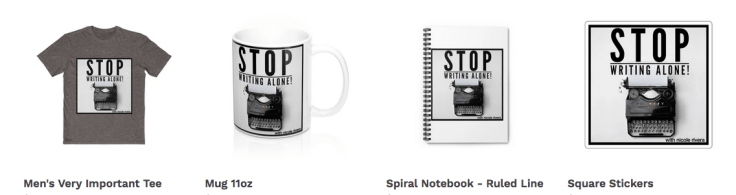 Support all things Stop Writing Alone with your purchase and your goodies. Whether you need a notebook, coffee mug, tote bag, or a cool sticker, this shop’s got it and more! If you love the logo as much as I do and want to proudly sport it, come check out the shop today!